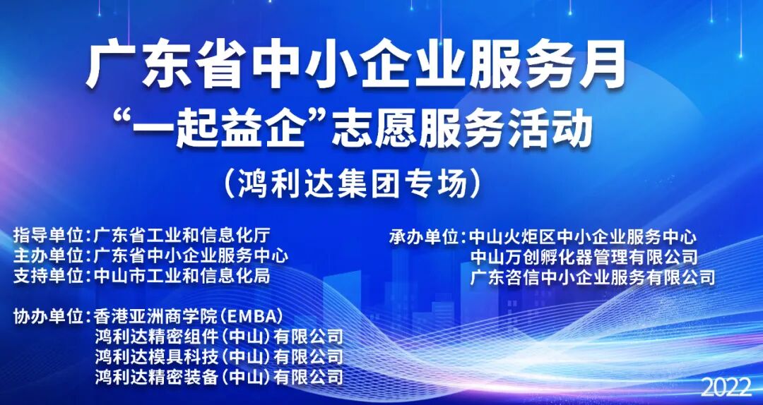 精术 悟道 趋势 至善 ![]() 为深入贯彻党中央、国务院关于促进中小企业健康发展的决策部署,帮助中小企业纾困解难和创新赋能,实现平稳健康发展,定于2022年在全国范围开展“一起益企”中小企业服务行动。 ![]() 欢迎参加 2022年广东省志愿服务促进中小企业发展活动(中山站) 广东省中小企业服务月“一起益企”活动 ( 走进鸿利达专场) 这是广东省中小企业服务中心联合中山火炬区小企业服务中心开展的“一起益企”走进中山企业系列活动的第二站。 ✦ ..... ![]() ![]() ![]() ..... ✦ ✦ ..... ![]() ![]() ![]() ..... ✦ ![]() 本次活动得以顺利开展,离不开省、市、区各级政府主管部门、领导的大力支持,以及各承办、协办单位的辛勤付出。 指导单位:广东省工业和信息化厅 主办单位:广东省中小企业服务中心 支持单位:中山市工业和信息化局 承办单位:中山火炬区中小企业服务中心 中山万创孵化器管理有限公司 协办单位:香港亚洲商学院(EMBA) 鸿利达精密组件(中山)有限公司 本次活动有三项议程安排: 专题课程培训 《疫情下如何打造高绩效团队与业绩提升》 参观企业学习先进管理和技术创新 领导致辞政策宣讲 目 标 1 提高政策惠达率。 2 扩大服务覆盖面。 3 增强企业获得感。 ![]()